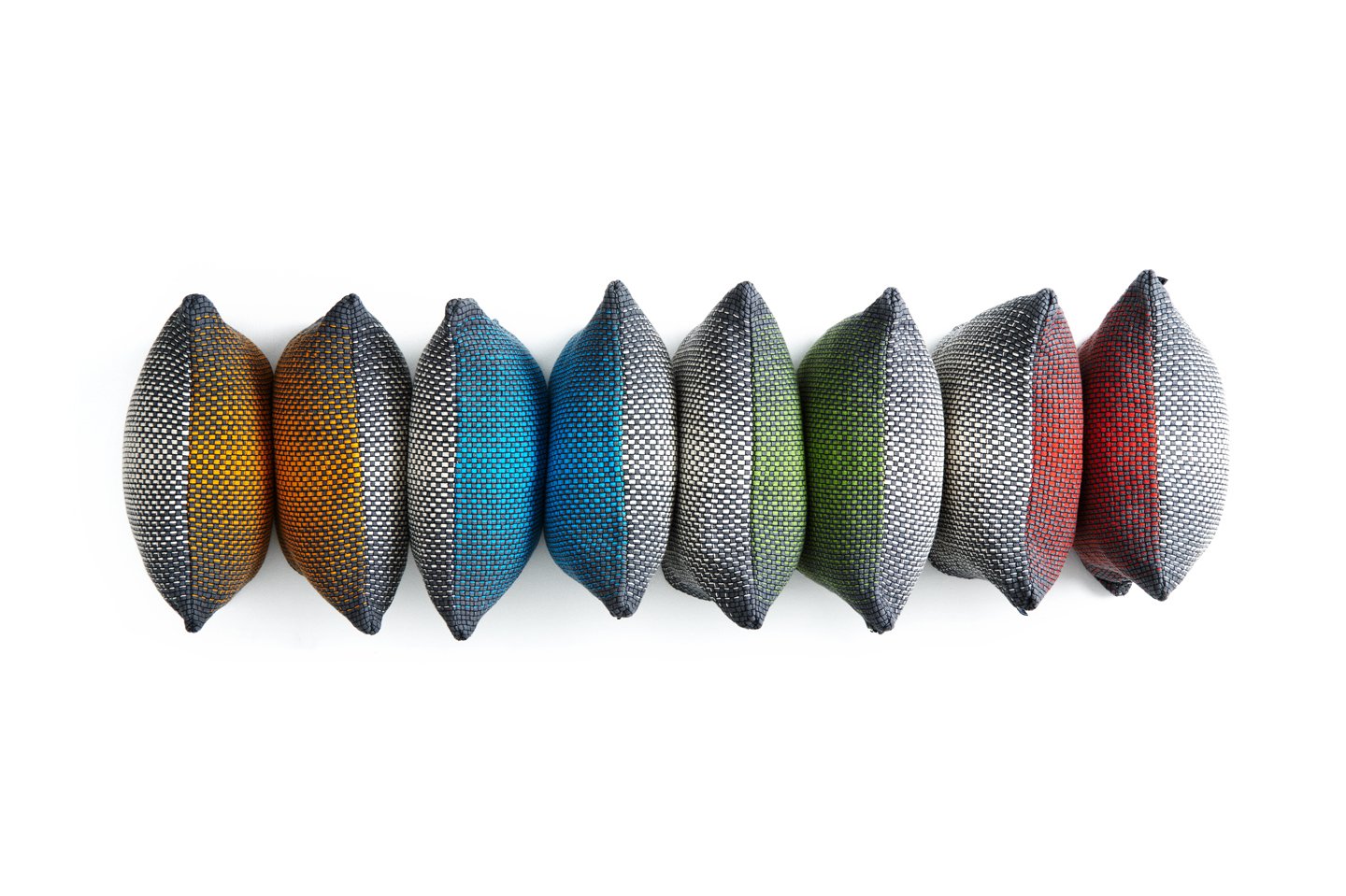 Cushions play a huge role the atmosphere of your room. A calming blue gradient provides a relaxing atmosphere. The gradient collection is available in four colors, yellow, blue, green and red. The other side is always in white-grey. On each side there is a pattern where the two colors are mixed into a gradient. Overall, there are nine color blends interlocking to create 81 different shades of color into an ocean turquoise.